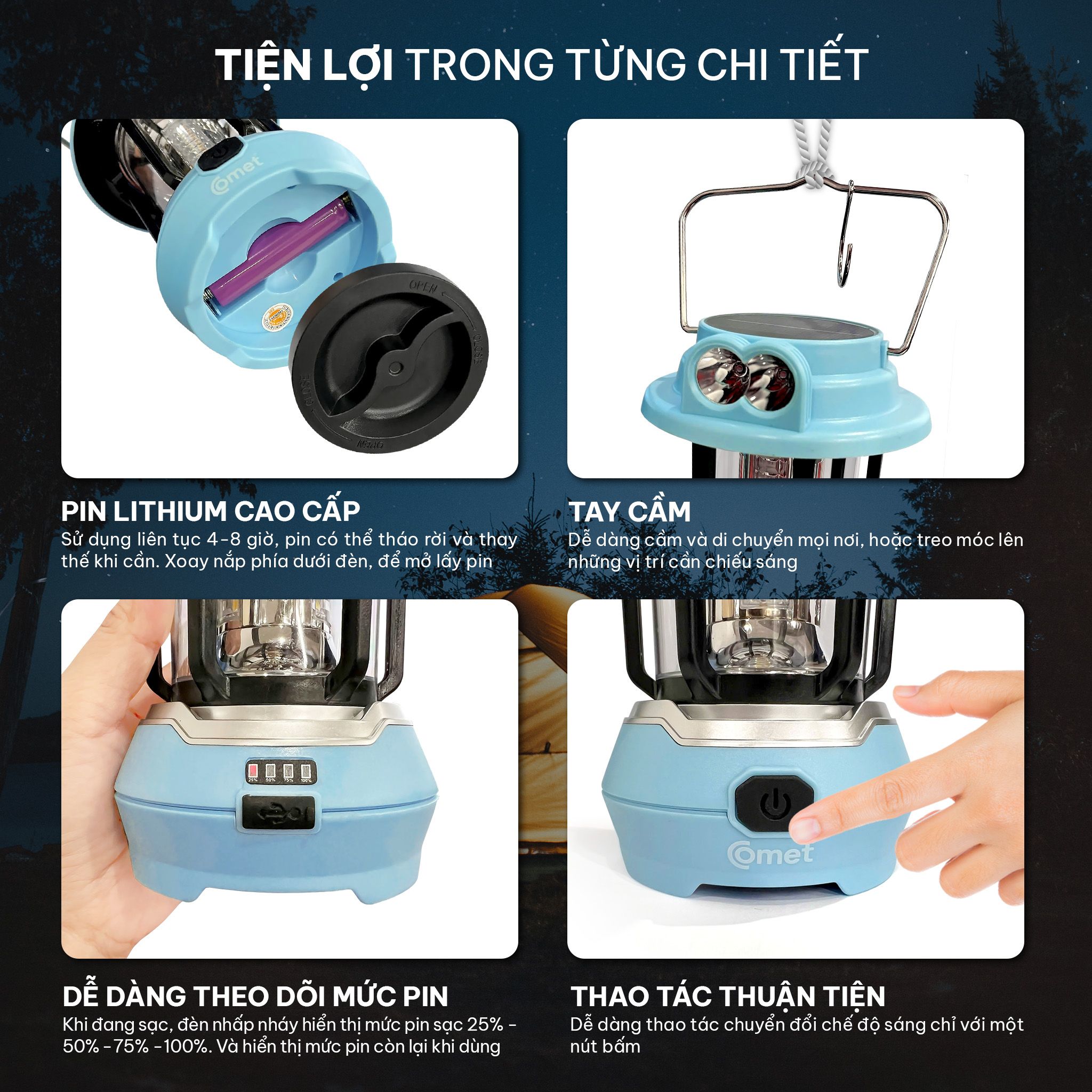 Đèn sạc LED Comet CRL3403S là người bạn đồng hành lý tưởng trong mọi hoàn cảnh: mất điện, mưa bão, dã ngoại, du lịch hay hoạt động ngoài trời.